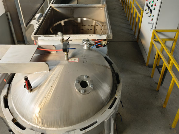 ●浸滲完畢,打開浸滲罐的蓋子,用吊鉤把浸滲籃吊離浸滲罐,讓浸滲籃及其內(nèi)裝零件表面粘附液滴干,放入甩干機(jī),將膠液甩干,然后把浸滲籃移至洗滌罐中。